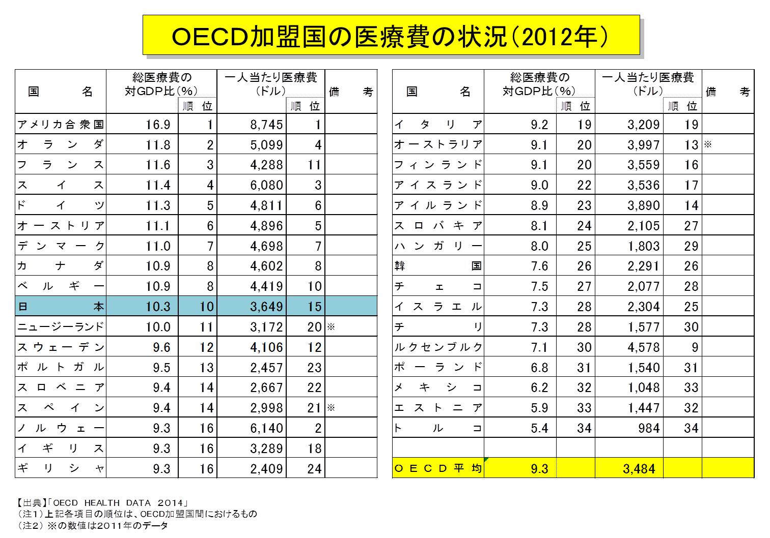 OECD加盟国の医療費の状況(2012年)