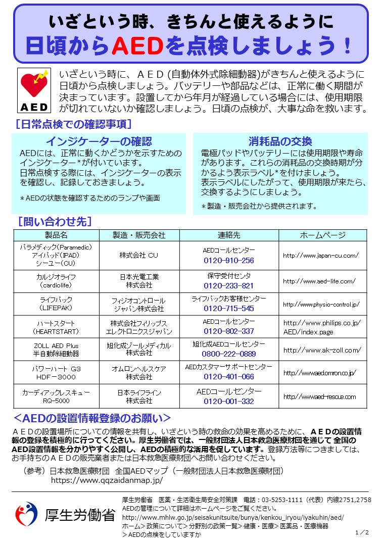 | 問い合わせ先 | : | AEDコールセンター 0120-802-337 |