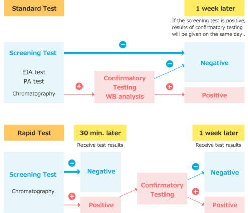 Once HIV enters the body, it replicates itself in the body. In reaction to the replication, the immune system produces antibodies to HIV. HIV screening tests currently and commonly used in Japan called ‘combined antigen-antibody tests’ look for evidence of these HIV-1/HIV-2 antibodies and HIV-1 antigen. As mentioned earlier, positive results from screening tests require a second test to confirm the presence of HIV. There are two types of confirmatory tests: Western Blot (WB) analysis and Nucleic acid amplification (NAT) tests. WB analysis detects HIV-1/HIV-2 antibodies, and NAT tests examine HIV genes.