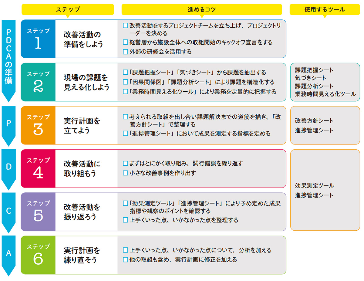 改善活動を進めるためには、職員からでてきた課題を整理することや、取組の成果を誰でもわかるように伝えること等が必要になってきます。改善活動に使えるツールを紹介します。