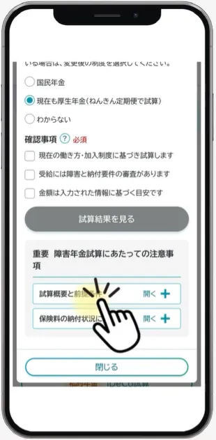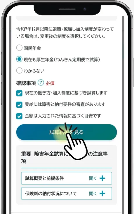 確認事項を一読し、チェックボタンをタップしたのち、「試算結果をみる」をタップします。