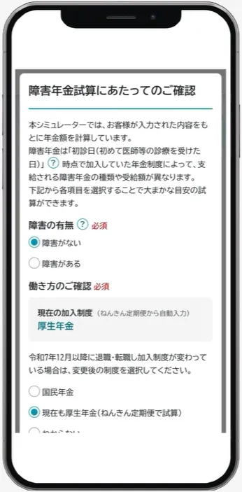 ※結果表示はあくまで仮定に基づき入力された試算の前提を示すものであり、実際の受給可否や年金額は正式な審査で決まります。