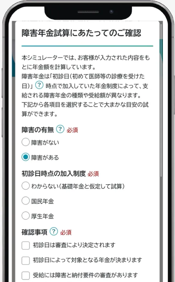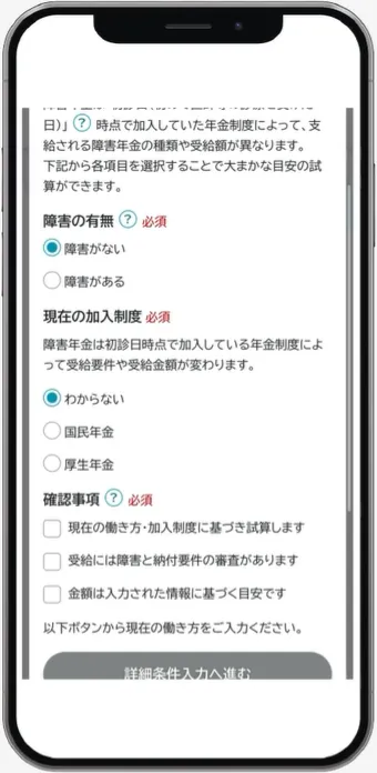 ※障害年金の試算に当たっての注意事項についてはこのサイトの下部の「試算概要と前提条件」や「保険料の納付状況について」ボタンをタップすると表示されますので、必ずお読みください。