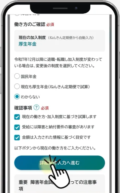 「わからない」や「国民年金」→「厚生年金」に制度を変更した方は「詳細条件入力へ進む」が表示されますので、働き方を入力してください。