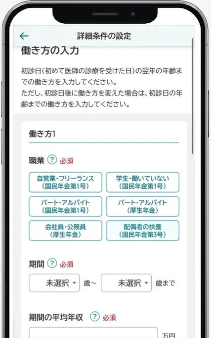「わからない」や「厚生年金」を選択した方は「詳細条件入力へ進む」が表示されますので、働き方を入力してください。