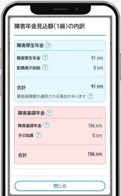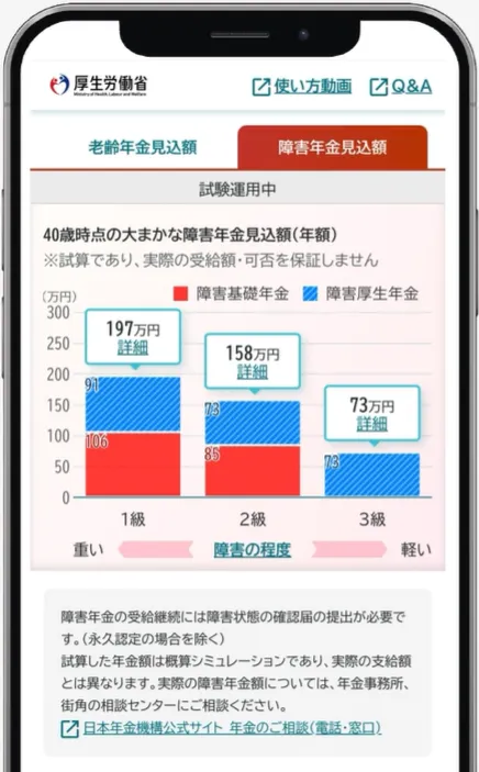 「わからない」または「国民年金」を選択すると障害基礎年金の試算結果が表示されます。