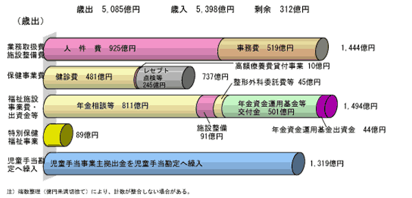 ・剰余312億円のうち、64億円(国庫財源分)を翌年度歳入に繰り入れ、91億円(健康保険料分)を事業運営安定資金、156億円(厚生年金保険料等)を厚生年金積立金等に組み入れた。 |