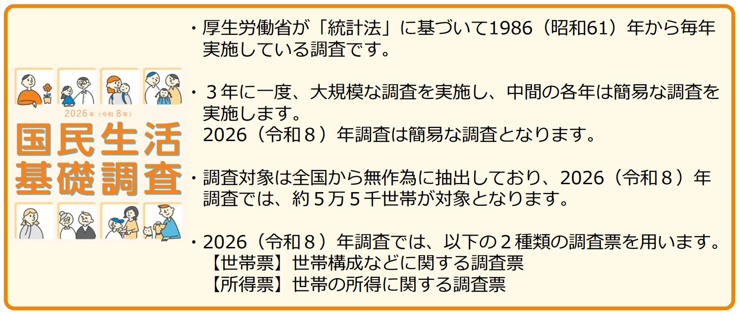 ホーム > 統計情報・白書 > 各種統計調査 > 厚生労働統計一覧 > 国民生活基礎調査 > 2026(令和8)年国民生活基礎調査 ご協力のお願い