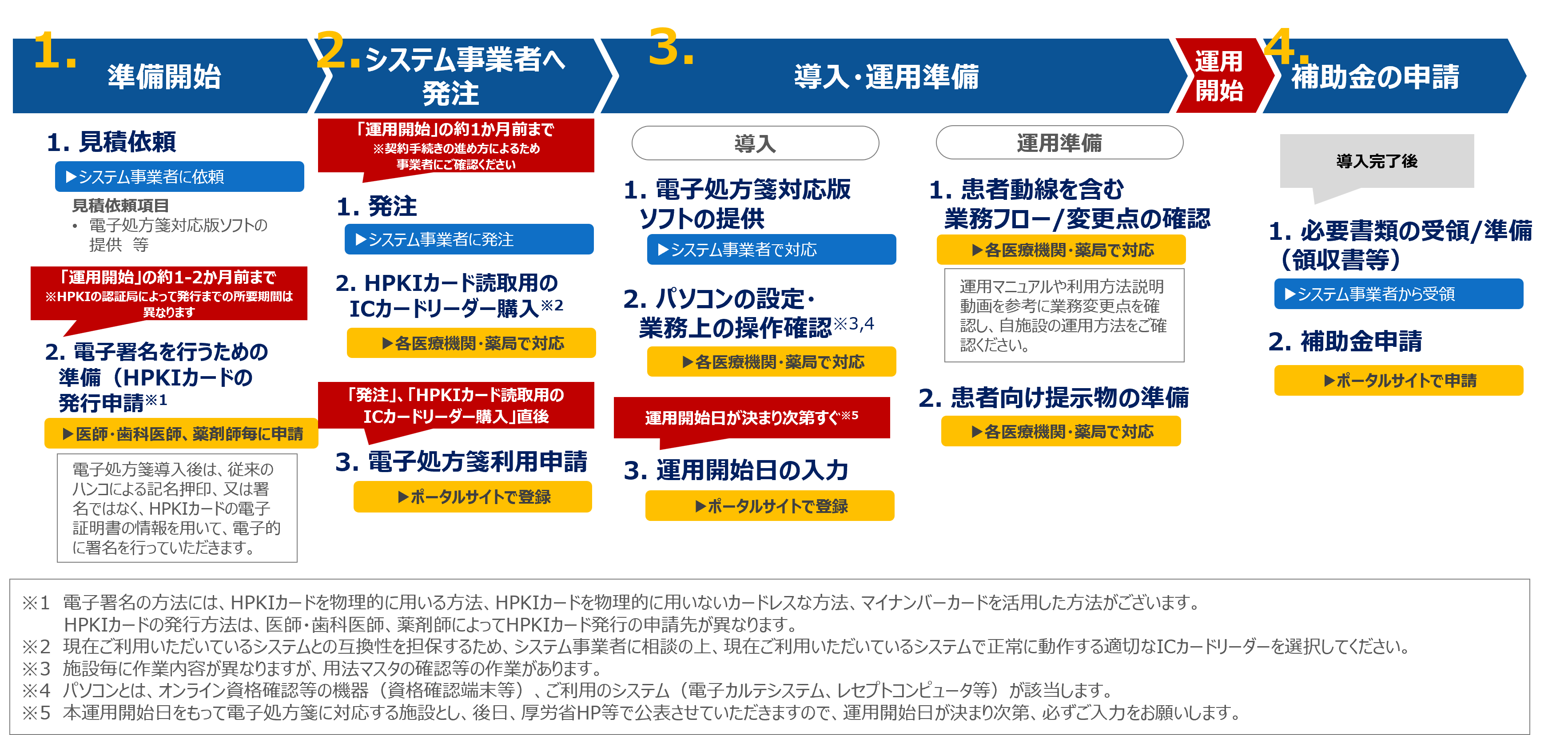 ◆電子処方箋の導入・運用に向けた詳細な手順や、導入運用に向けた申請関連等(電子処方箋の利用申請、運用開始日入力、補助金申請)は医療機関等向け総合ポータルサイトをご確認ください。
