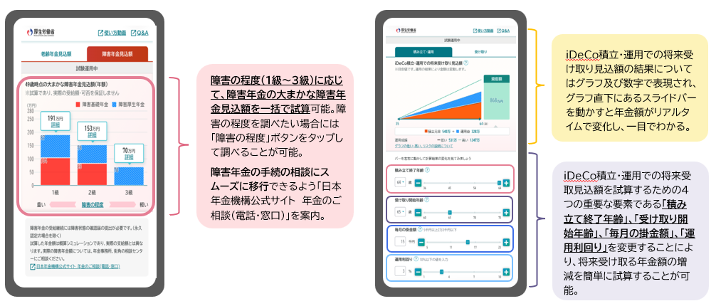 今般、公的年金シミュレーターの機能として、障害年金、iDeCoの試算機能を新たに追加するなど大幅な改善を加え、令和8年4月1日から、試験運用を開始いたします。