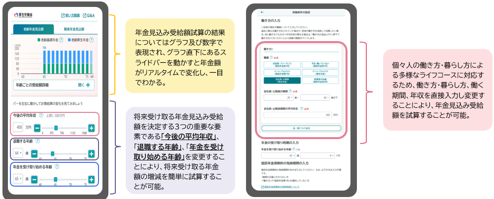 厚生労働省は、スマートフォンやタブレットで、年金額を簡単に試算できるツール「公的年金シミュレーター」を運用しております。