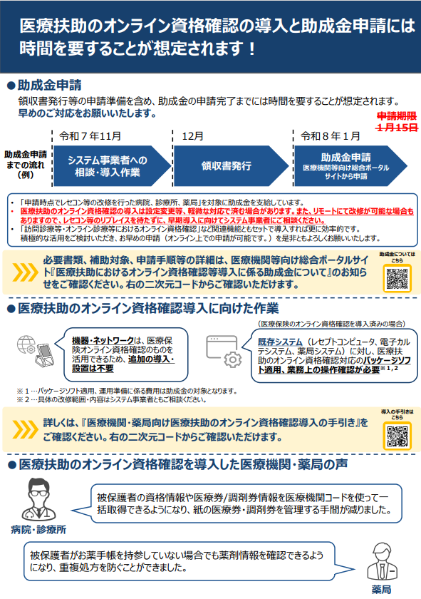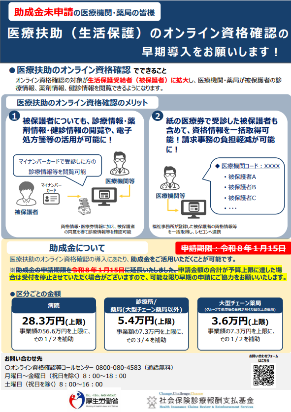 医療扶助のオンライン資格確認の運用効率化や適正化を進め、導入が遅れている医療機関等に対しても周知・広報を継続的に行いました。