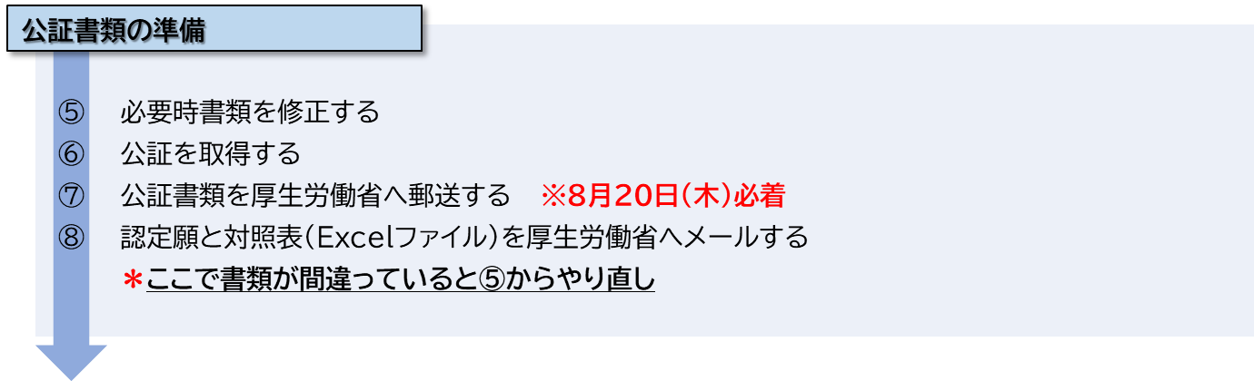 書類の準備ができたら公証をとって厚生労働省に郵送してください。