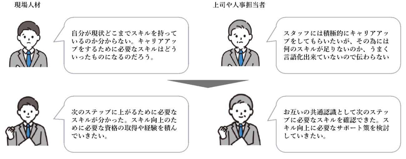 ・各スタッフの一人ひとりがどんな役割を担い、スキルを発揮しているか評価して、昇進や昇給などの処遇に反映させることによって、従業員のさらなるスキルアップに繋がる