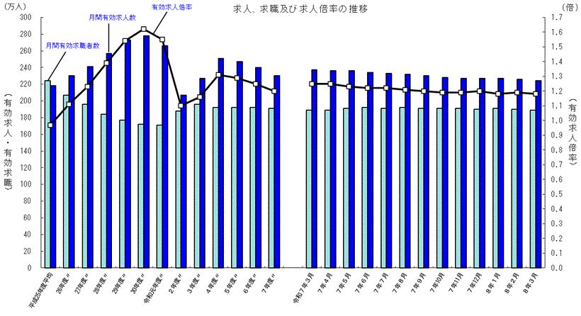 令和7年度平均の有効求人倍率は1.20倍となり、前年度の1.25倍を0.05ポイント下回りました。