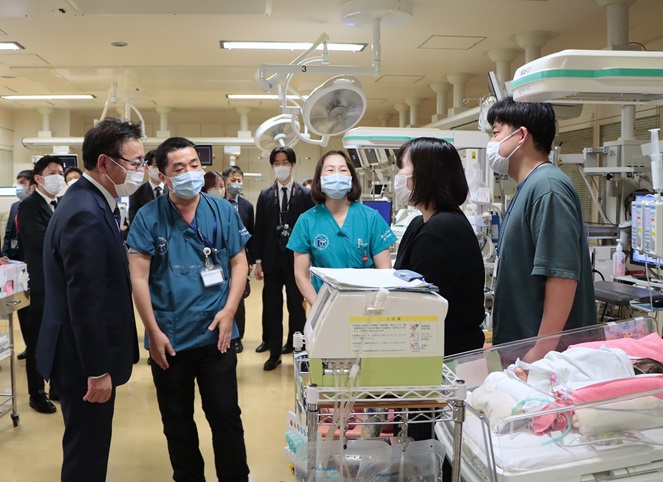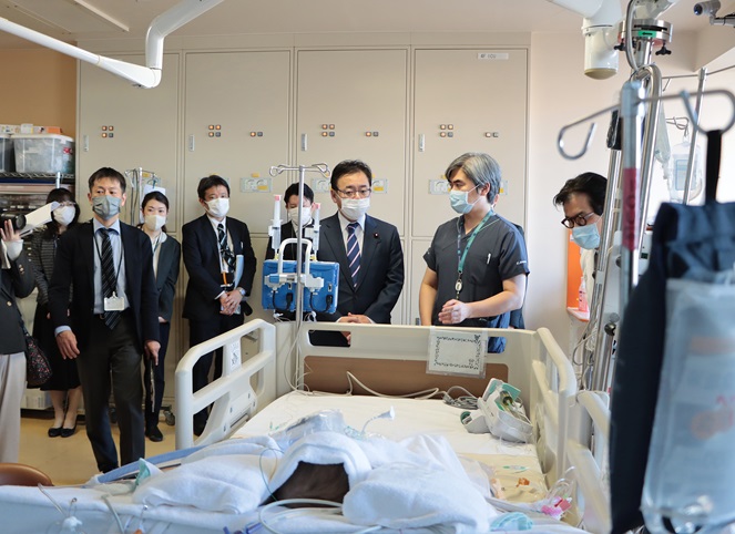 また、上野厚生労働大臣は、世界トップレベルの治療成績を有する新生児集中治療室(NICU)と、高度先駆的医療を提供する小児集中治療室(PICU)の現場を視察し、説明を受けました。