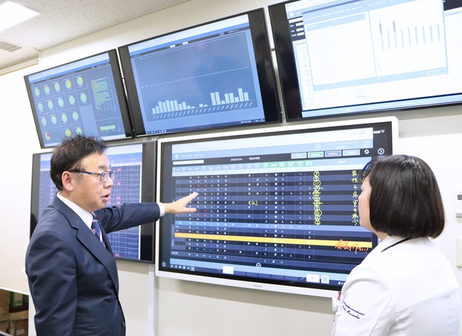 院長室では、複数の手術室の様子や手術の状況が確認できる「OPE室モニター」について、説明を受けました。