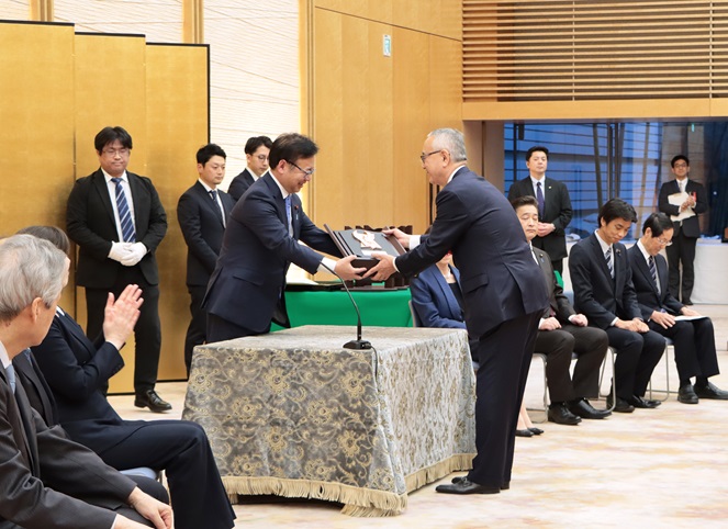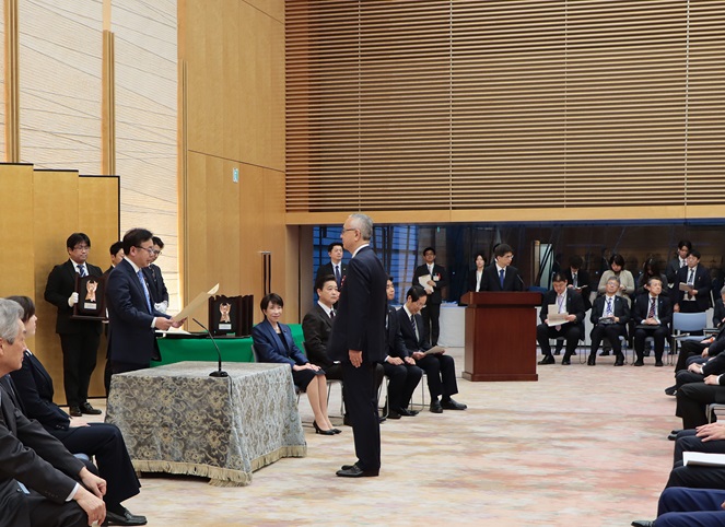 この式典に、上野厚生労働大臣が出席し、厚生労働大臣賞を受賞した塩野義製薬株式会社に表彰状を授与しました。