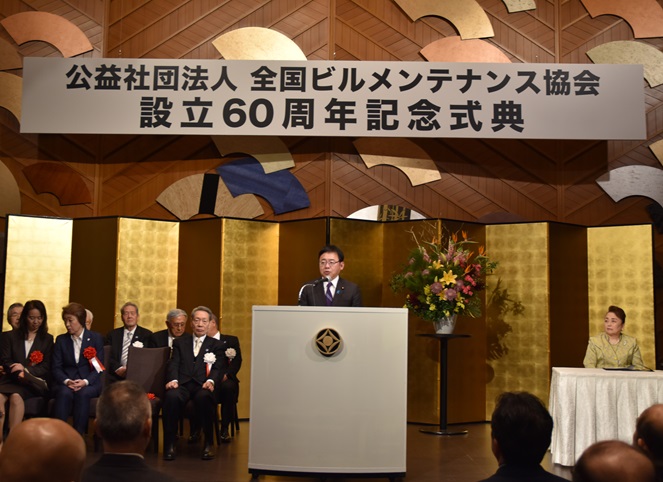 今回の式典は、建築物の清掃管理、設備管理、警備防災などの業務を行う団体として設立した公益社団法人全国ビルメンテナンス協会が、設立60周年を迎えることを記念し、開催したものです。