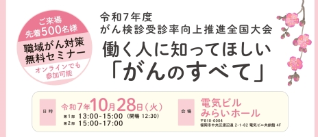 第4期の「がん対策推進基本計画」の個別目標である「がん検診受診率60%」の目標達成に向けて、国民にがん検診への関心を深めていただくとともに、官民一体となったがん対策への取組の意識の高揚を図るために、「がん検診受診率向上推進全国大会」を開催しております。