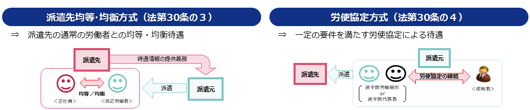 こうした状況を踏まえ、派遣労働者の待遇について、派遣元事業主には、派遣先均等・均衡方式(派遣先の通常の労働者との均等・均衡待遇)または労使協定方式(一定の要件を満たす労使協定による待遇)のいずれかを確保することが義務づけられています。
