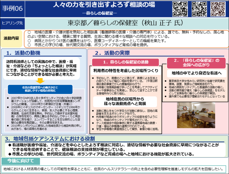 令和4年度厚生労働省看護職員確保対策特別事業において、地域の多様な場において人々の生活を支える看護職員の活用について、今後の地域における看護活動や事業展開の参考となるよう、先駆的な活動を行っている看護師や団体に対してヒアリングを行い、活動のきっかけや活動内容等をまとめました。