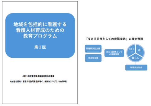 令和5年度厚生労働省看護職員確保対策特別事業において、地域共生社会の実現にあたり、看護師が「治す医療」ばかりではなく、「支える医療」の実践者としての力を身に着けることができるよう、訪問看護師など人々の暮らしに近いところに勤務する看護職を対象とする研修プログラムを作成しました。
