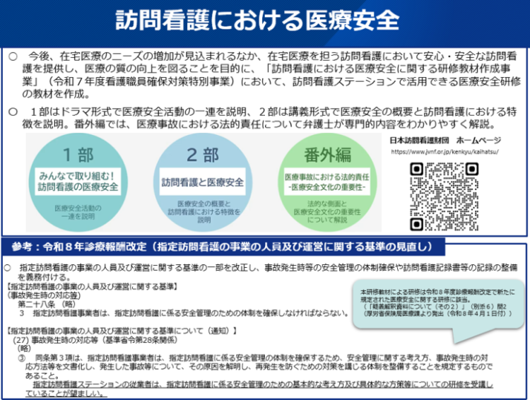 令和7年度厚生労働省看護職員確保対策特別事業において、今後、在宅医療のニーズの増加が見込まれるなか、在宅医療を担う訪問看護において安心・安全な訪問看護を提供し、医療の質の向上を図ることを目的に、訪問看護ステーションで活用できる医療安全研修の教材を作成しました。