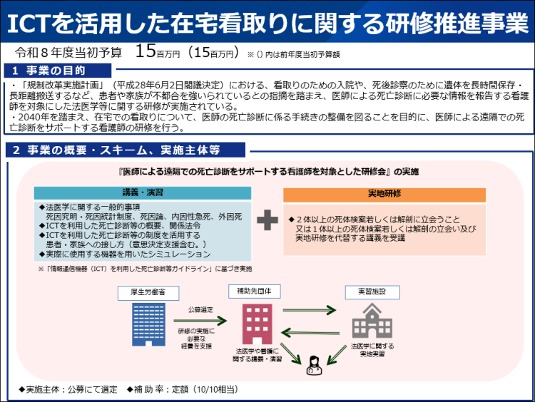 2040年を踏まえ、在宅での看取りについて、医師の死亡診断に係る手続きの整備を図ることを目的に、医師による遠隔での死亡診断をサポートする看護師の研修を実施しています。