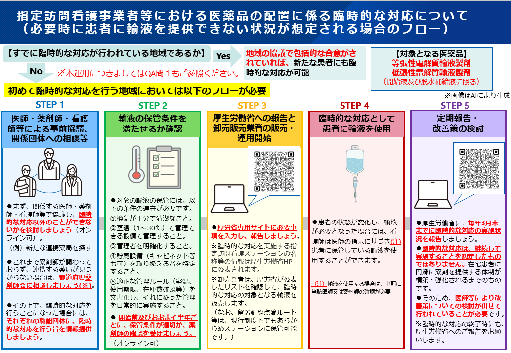 - 「指定訪問看護事業者における医薬品の取り扱いについて」(令和7年12月25日付け医薬発第1225第5号)に基づき、臨時的な対応を実施する指定訪問看護事業者の一覧はこちらに掲載予定です。