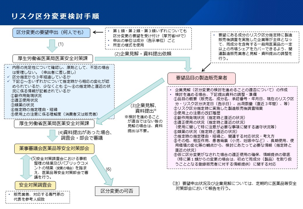 要望申出がなされたものについては、内容の充足性を確認した上で、製造販売業者に当該要望を伝えるとともに、要望に対する製造販売業者の見解・審議に必要な資料提出の依頼を行い、資料が提出されたものから順次、薬事審議会医薬品等安全対策部会 安全対策調査会で審議することとしています(下記「リスク区分変更検討手順」参照)。