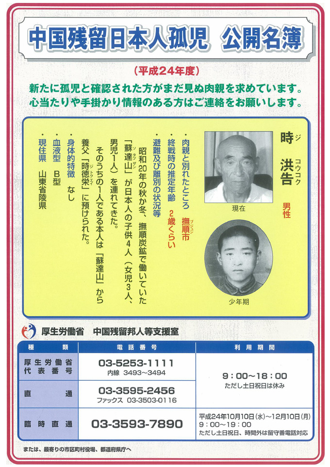 平成24年度において新たに中国残留日本人孤児と確認された方です。