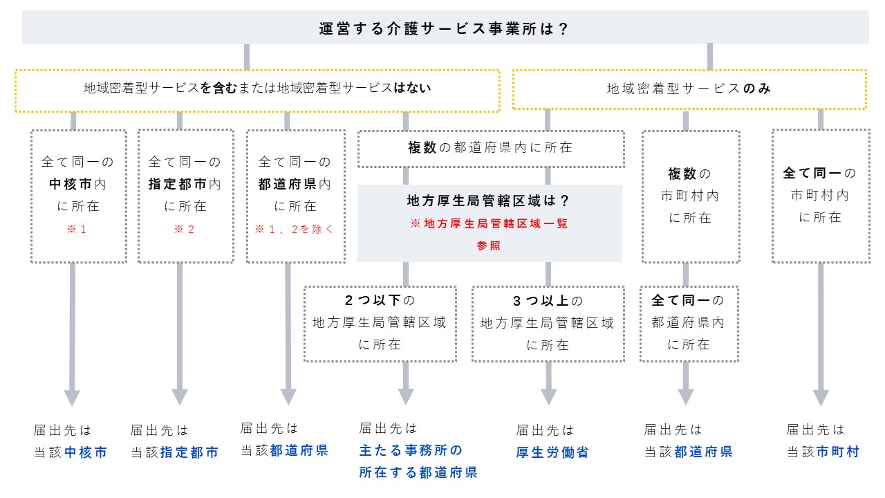 業務管理体制の整備に関する届出書の届出先は、国・都道府県・指定都市・中核市・市町村にわかれており、事業者が運営する事業所の所在地により異なります。