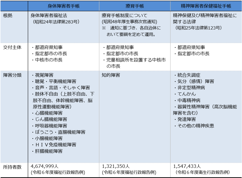 障害者手帳は、身体障害者手帳、療育手帳、精神障害者保健福祉手帳の3種の手帳を総称した一般的な呼称です。