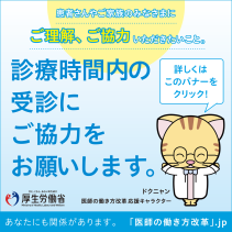 また、医療機関では、医師の働き方改革の取組の一環として、患者さんやご家族への病状説明を診療時間内に実施することや、外来診療の受付時間を短縮するといった取組も進んでいます。日頃から医療機関の診療時間を意識していただき、例えば、病状、検査、手術の説明を受けるといった場合には、確実に夜間や休日を避け、平日の診療時間内となるようご協力をお願いします。