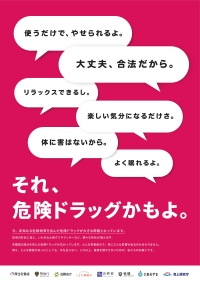 厚生労働省では毎年、国民の皆様に対して薬物乱用の正しい知識を普及啓発するため、「不正大麻・けし撲滅運動」「『ダメ。ゼッタイ。』普及運動」「麻薬・覚醒剤・大麻乱用防止運動」の薬物乱用防止啓発運動を実施し、ポスターやリーフレットを用いた啓発活動を行っております。