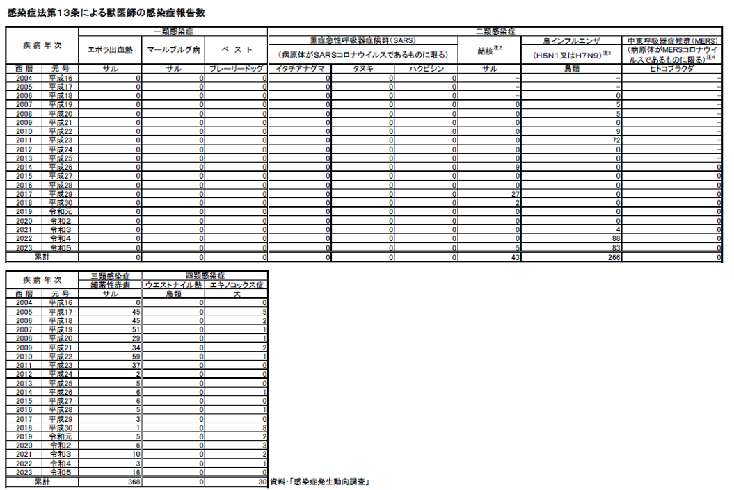 • 注3:鳥インフルエンザ(H5N1又はH7N9)の報告数は、2006年(平成18年)6月12日からの数値である。 ただし、2006年(平成18年)6月12日から2008年(平成20年)5月11日まではインフルエンザ(H5N1)の鳥類としての報告数であり、2008年(平成20年)5月12日から2013年(平成25年)5月5日までは鳥インフルエンザ(H5N1)としての報告数である。 また、数値は、1箇所における複数鳥類の発生の場合はまとめて1例(1件)としている。
