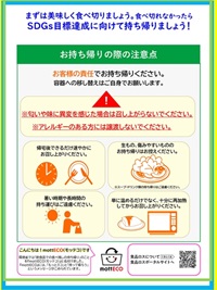 飲食店において、食べ残し持ち帰りの際の留意事項の説明を行う際に、お渡しいただくことを想定したチラシです。 事業者の方に御活用いただけます。 (作成元:消費者庁ホームページ) 日本語版 <翻訳版> English(英語版) Chinese(中文)(中国語版) Korean(한국어)(韓国語版) |