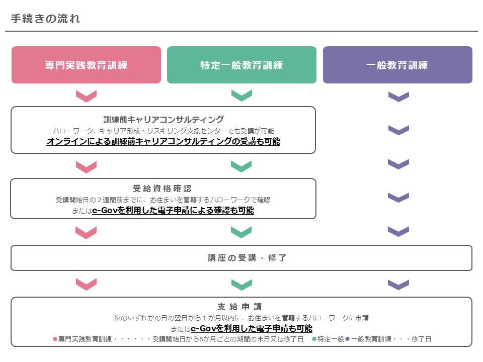 教育訓練給付金の支給を受けるには、受講前後で所定の手続が必要です。受講する教育訓練の種類によって必要な手続が異なるため、受講開始前によくご確認ください。