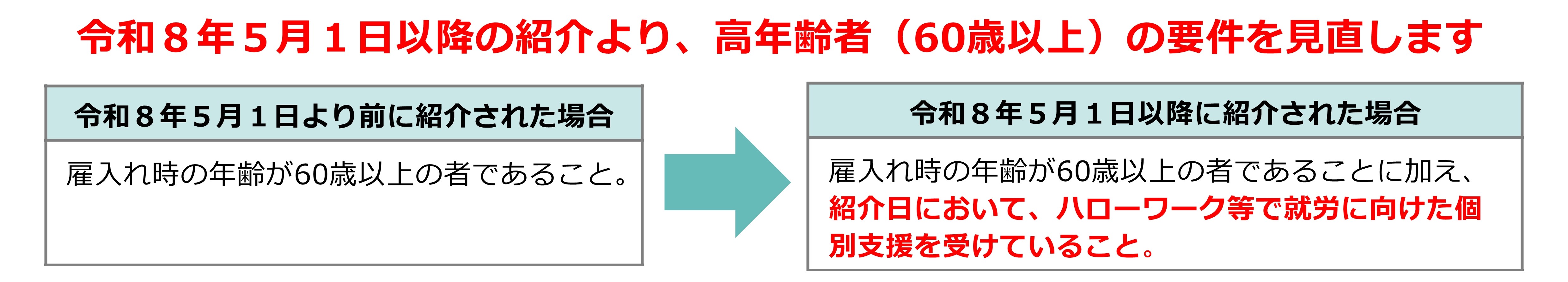 令和8年5月1日以降は、ハローワーク等において就労に向けた個別支援を受けている高年齢者(60歳以上)の方が特定求職者雇用開発助成金の対象労働者となります。