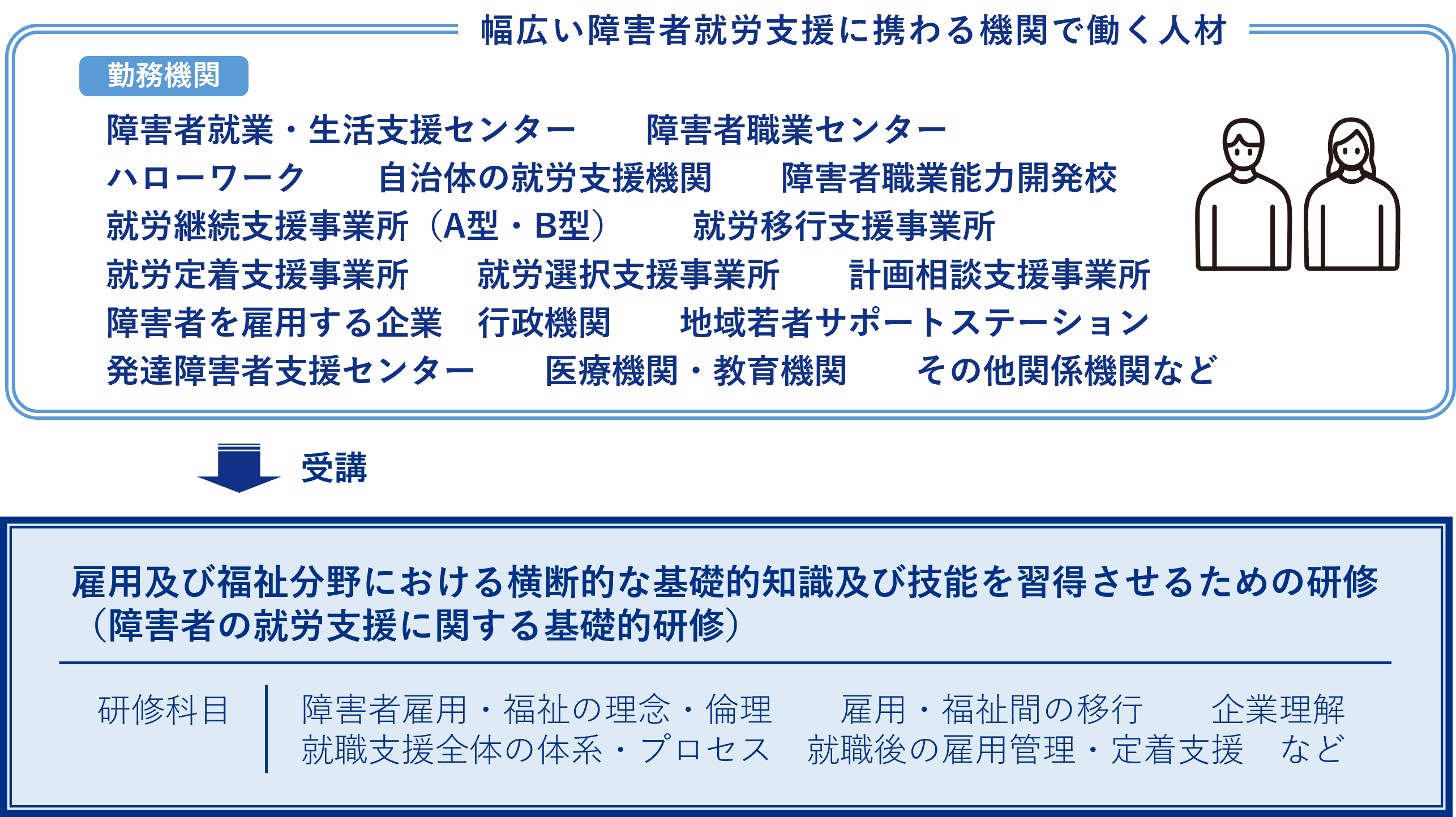 幅広い障害者就労支援機関で働く方を対象とした、福祉と雇用の分野横断的な基礎的知識・スキルを付与する研修です。