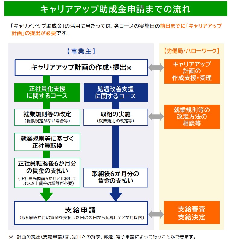 ・キャリアアップ助成金の活用に当たっては、各コース実施日の前日までに「キャリアアップ計画」(労働組合等の意見を聴いて作成)等を作成し、提出することが必要です。