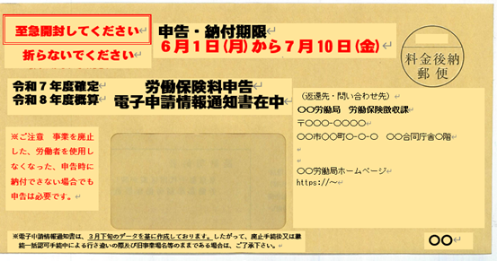 電子申請が義務付けられている事業場(※1)は、今年度(令和8年度)の年度更新から、例年お送りしている紙の申告書の送付がなくなり、代わりに、電子申請に必要な情報を記載した通知書等(※2)を送付いたします。