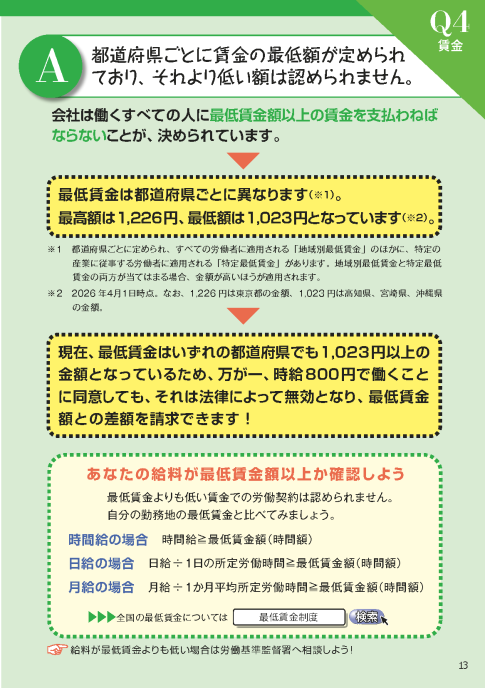 - 【Q4解説】 都道府県ごとに賃金の最低額が定められており、それより低い額は認められません。