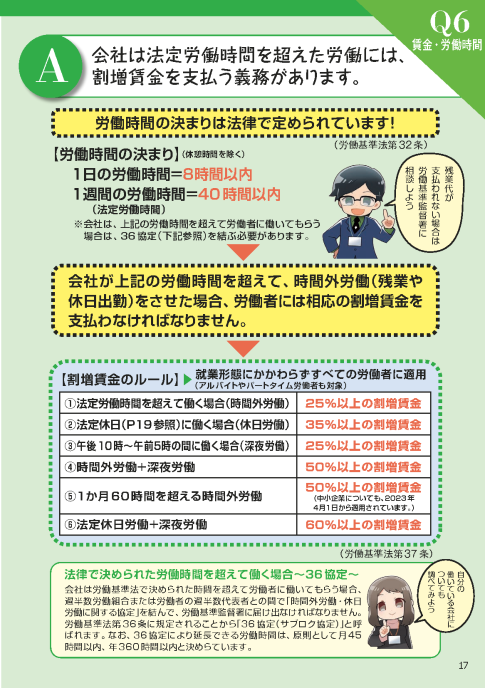 - 【Q6解説】 会社は法定労働時間を超えた労働には、割増賃金を支払う義務があります。