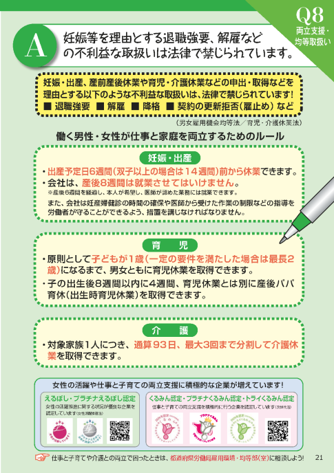 - 【Q8解説】 妊娠等を理由とする退職強要、解雇などの不利益な取扱いは法律で禁じられています。