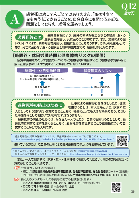 - 【Q12解説】 過労死は決して人ごとではありません。「働きすぎて命を失う」ことがあることを、自分自身にも関わる身近な問題としてとらえ、理解を深めましょう。