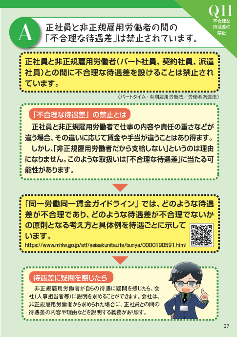 - 【Q11解説】 正社員と非正規雇用労働者間の「不合理な待遇差」は禁止されています。