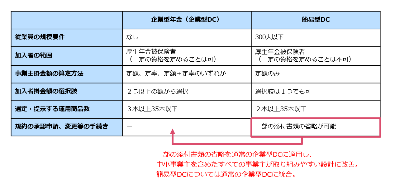 中小企業における企業年金の活用状況を踏まえ、 2018年に中小企業向けに創設された簡易企業型年金(簡易型DC)において簡素化されていた手続きのうち、一部については通常の企業型DCに適用することとし、中小事業主を含めたすべての事業主が取り組みやすい設計に改善します。また、簡易型DCについては通常の企業型DCに統合します。