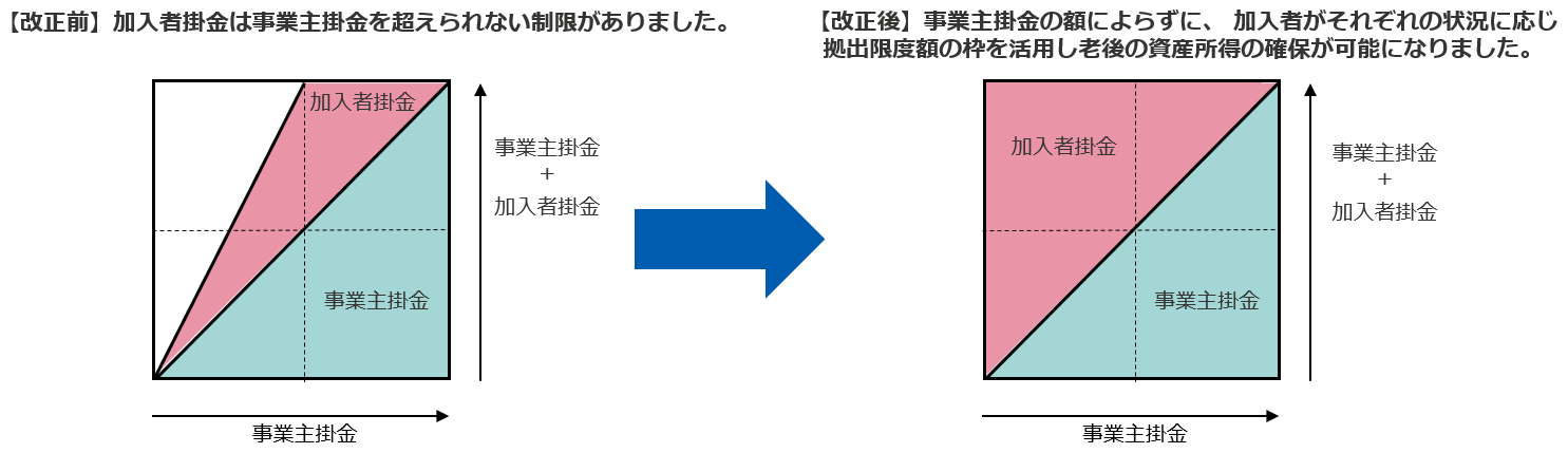 企業型DCの加入者は、事業主の拠出に上乗せして加入者掛金を拠出すること(マッチング拠出)が可能ですが、マッチング拠出における加入者掛金の額は、事業主掛金の額を超えてはならないという制限が設けられています。事業主掛金の額によらずに、 加入者がそれぞれの状況に応じ拠出限度額の枠を十分に活用し老後の資産所得の確保が可能となるよう、 当該制限を撤廃します。